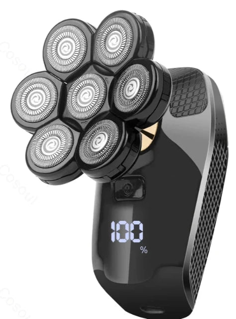7 floating shaving heads with ultra flexible pivoting blades that adapt to the contours of your head, face & jaw. With additional add ons to allow beard trimming and nose trimming.